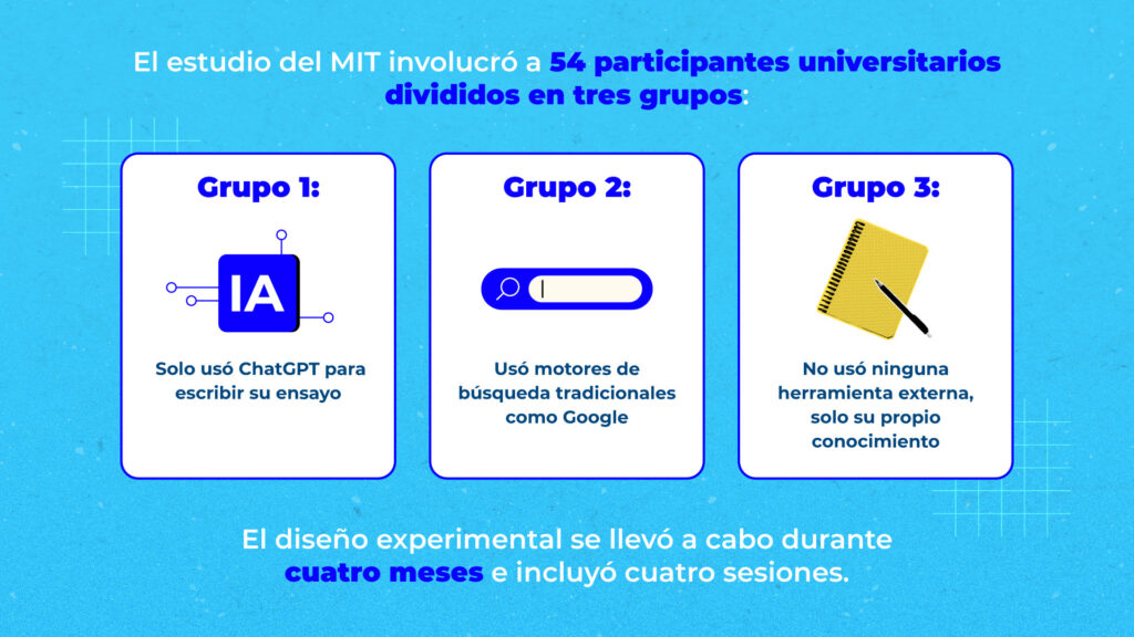 El estudio del MIT utilizó un diseño experimental con una muestra de 54 participantes universitarios, a quienes se les asignó, aleatoriamente, una de tres condiciones para escribir un ensayo. Cada grupo debía seguir instrucciones distintas: el primero podía usar exclusivamente un modelo de lenguaje —en todos los casos fue ChatGPT—; el segundo tenía permitido recurrir únicamente a buscadores web tradicionales, como Google; y el tercero debía escribir el ensayo basándose solo en su propio conocimiento, sin apoyarse en herramientas externas.