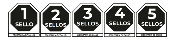 Algunos productos como azúcar, sal, café, aceites o agua embotellada están exentos, a menos que incluyan declaraciones nutricionales. Y si el empaque es demasiado pequeño, se utiliza un sello numérico que indica cuántos de los cinco nutrimentos críticos excede el producto, tal como se ilustra en la Figura 4.